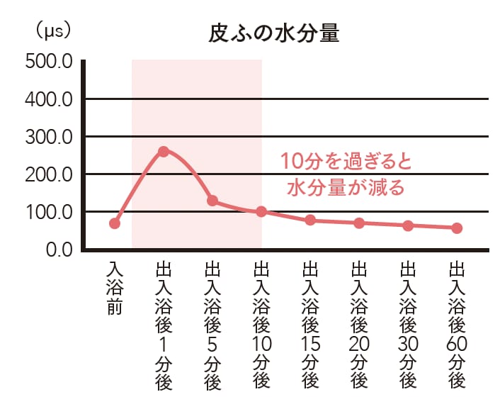「入浴後10分までは、皮膚の水分量が入浴前より多いものの、10分を過ぎるとどんどん減っていきます。お風呂場の蒸気で柔らかくなった肌は、とても乾燥しやすい状態に。可能ならば、お風呂上がりすぐに保湿ケアをするようにしましょう」。