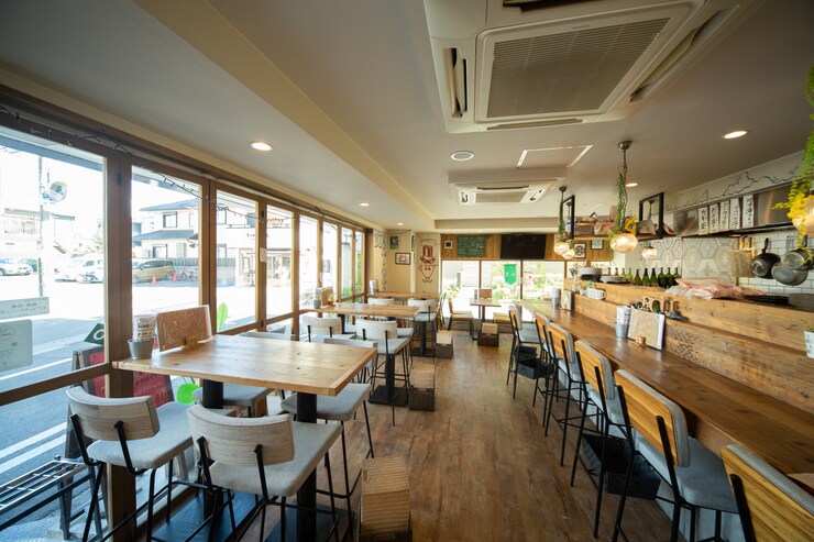 椅子やテーブルの木目に温かみを感じる店内。オープンキッチンなので開放感もあります