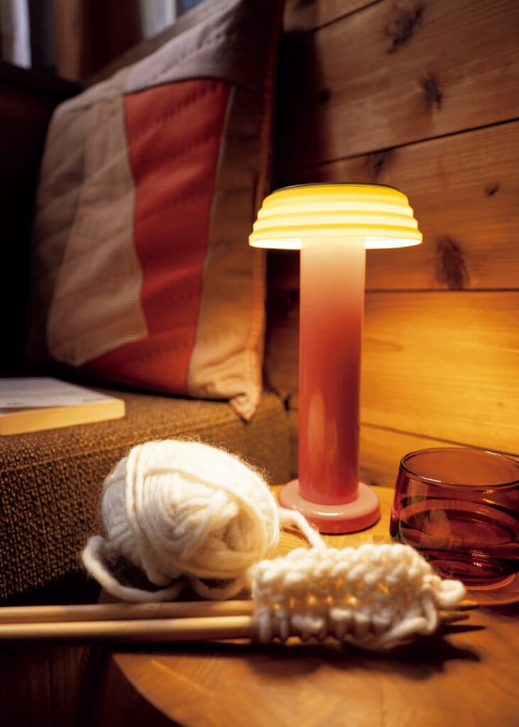 編み物をしていると心が整って、いつしか一日の終わりのルーティンになっていた。手元の照明を探して立ち寄った『モマ デザインストア』で出合ったのが、〈ソーデン ライト〉のテーブルランプ。1980年代、ポストモダニズムのデザイン集団「メンフィス」のメンバーとしても活躍したジョージ・ソーデンによるデザインで、ポップなカラーリングに比して、シリコーンのシェードを通した光が優しい。3段階の調光で、使い勝手もいい。¥12,430(モマ デザインストア 表参道 03−5468−5801) その他スタイリスト私物