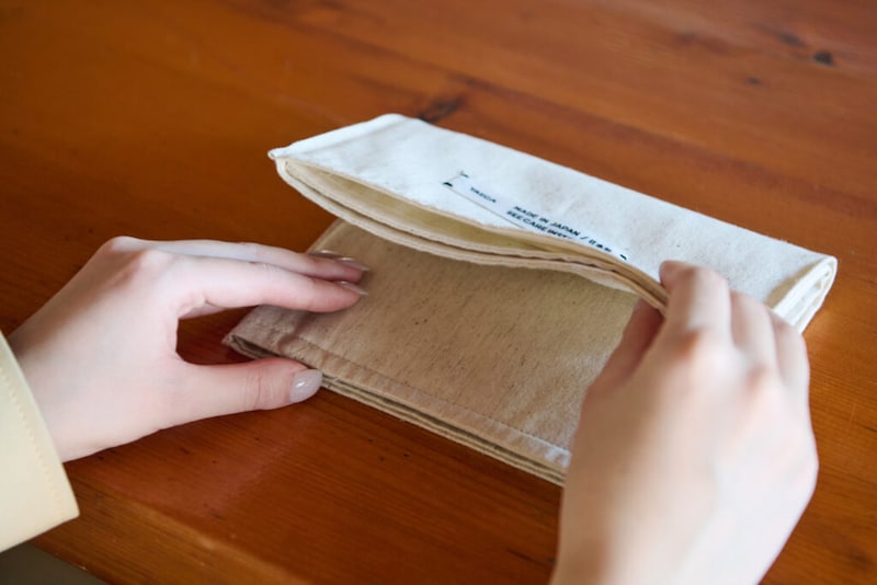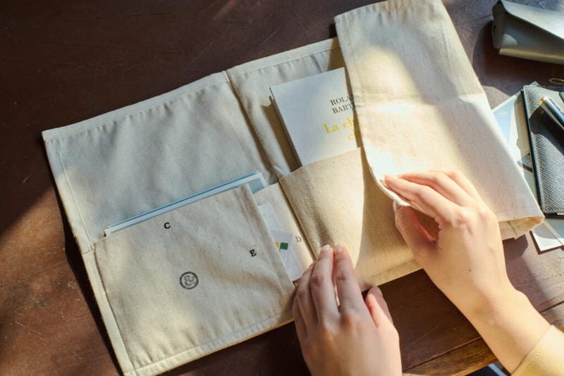 折りたたむことで中身をすっぽりと包み込み、汚れや擦れから優しく保護。本のサイズに合わせて形を変えられるのも魅力です。