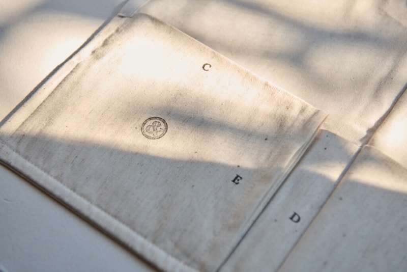 生地にはオリジナルファブリックである国内生産のコットンリネンを使用し、ふっくらと程よい厚みに。縫製も国内で丁寧に行い、ポケットの&ロゴやアルファベットのスタンプはすべて手押し。細部にまで手仕事の温かみを感じるアイテムです。