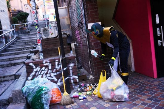 それから前身のヒーロー“スラウザー”として活動を開始。2017年に渋谷のハロウィンで清掃ボランティアしたことを機に、渋谷が“バトルフィールド”になった。だが、24歳で転職した企業で上司からパワハラを受けてうつ病を発症。ヒーロー活動は休止に追い込まれる。そんな危機から救ってくれたのが、彼が師匠と慕う方南町のリアルライフヒーローである、“ベビーカーおろすんジャー”だ。