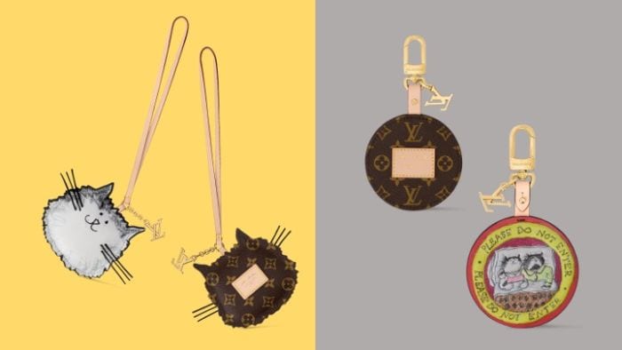 元スーパーモデル兼スタイリストであるグレース・コディントンによる「Louis Vuitton Travels With Grace Coddington」コレクションの一部として登場した一風変わったバッグチャーム。彼女が愛したペルシャ猫をたたえるデザインが微笑ましい。画像の左は、ふわふわしたふくらみがあり、繊細なひげを生やした愛らしい猫の顔をレザーでかたどったもの。右は、ブランケットの下で寄り添う2匹の愛らしい猫を思いのままに描いた、彼女の遊び心あふれるスケッチを上質なレザーにプリントしている。人懐っこいペルシャ猫は、平和や人間関係の調和をもたらすモチーフにもなるといわれている。