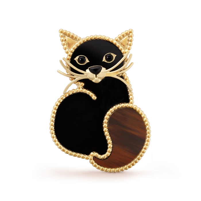 おおらかな自然を着想源に、オーナメンタルストーンでさまざまな動物たちを描き出したクリップのコレクション「ラッキー アニマルズ」の一つ。1950年代に一世を風靡(ふうび)した「ラ ブティック」コレクションの流れをくんだ、メゾン独自の表現が生き生きとした表情で魅了する。 豊かな尻尾を立て、はにかむように振り返る様子が猫の特性をよくとらえている。一粒ずつ職人たちが磨き上げた、メゾンのシグネチャーであるゴールドビーズの縁取りも優美なシルエットを引き立てているよう。オニキスは、仕事運を上げてくれるストーンでもあるので、仕事の会食の席などで場を盛り上げるアイテムになってくれそうだ。