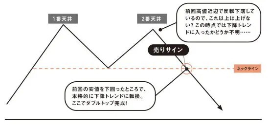 天井が2つあるこのチャートの形は「ダブルトップ」といって、相場の天井を示す典型的なチャートパターンで、下降トレンドへの転換を示唆します。