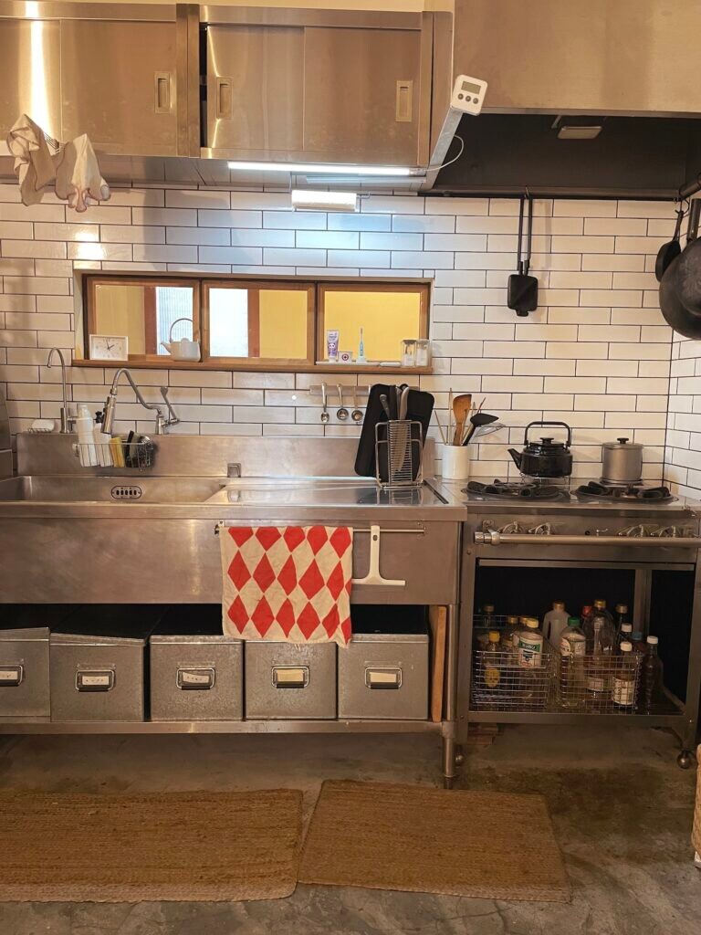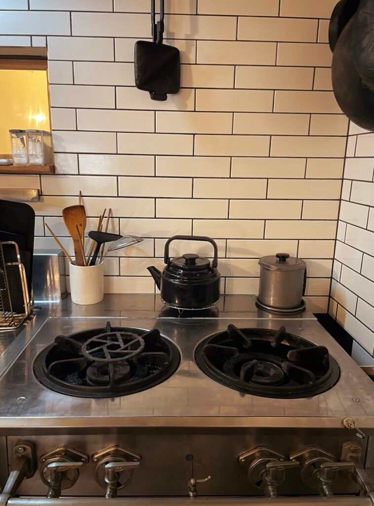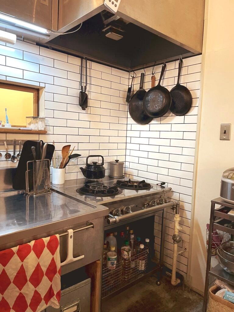 こうして導入された業務用のステンレス製シンクは、蓄積した汚れを、たまにの掃除で乱暴に擦っても耐えてくれるし、何度でもピカピカに復活してくれる。そして、これまた業務用の大きなガスコンロも同様だ。