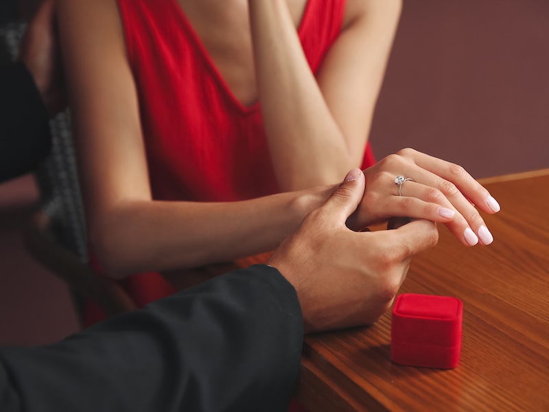 振り返ると、亮太が大きなバラの花束と共に、指輪の箱を開けながらひざまずいている。