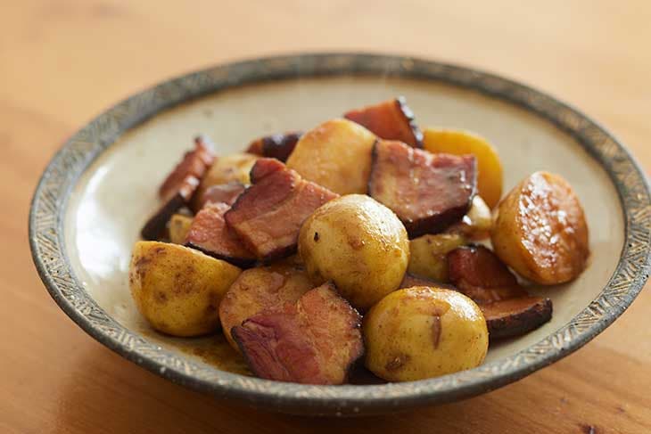 「新じゃがは皮が薄く、香りも楽しめるので皮ごと調理します。ベーコンとカレー粉を組み合わせることでいつもの煮っころがしとは少し違う新じゃがを味わえます。おつまみにもおすすめです!」(料理監修・ウェッティさん)