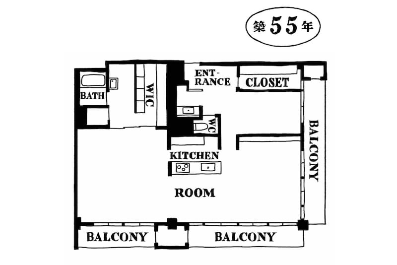 リノベーションをするにあたってこだわったのは、広さを伸びやかに生かすこと、飾れること。それで、間仕切るのをやめようと思いつく。2LDKだった間取りを、端から端まで13mもある一空間にしてしまった。