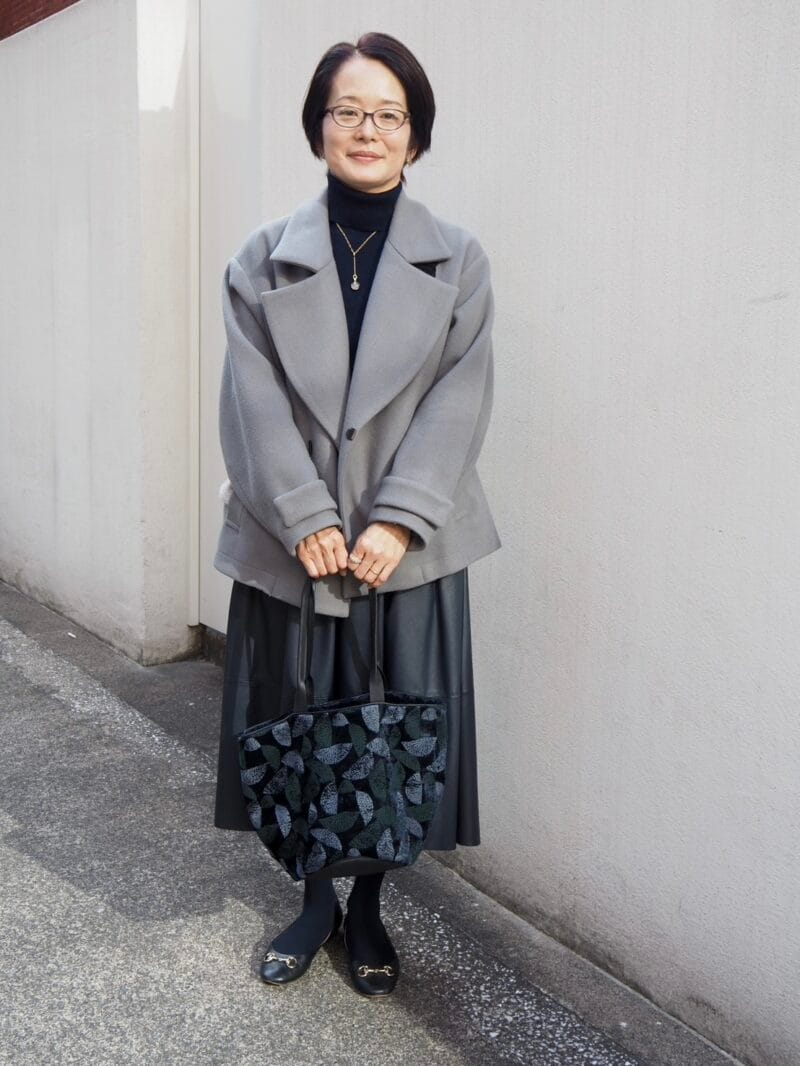 この日、表参道へ買い物に来ていたあきぽんさん。上下黒でシックにまとめつつ、ミディ丈のウールジャケットをオン。イタリアのアパレルブランド「ラ・フォンタナ・マジョーレ」のレザースカートはほどよい光沢感があり、上品な大人の着こなしにマッチ。