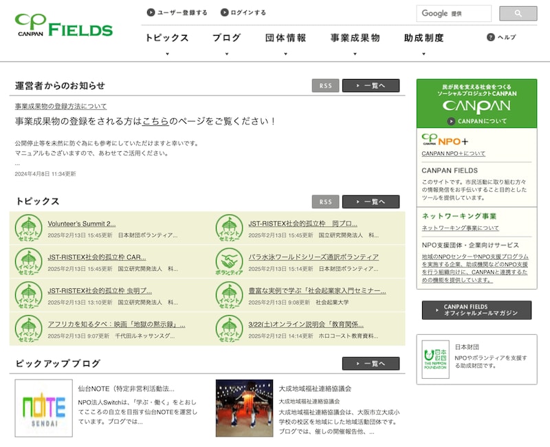 日本財団が運営するコミュニティサイト「CANPAN(カンパン)」(外部リンク)は、市民やNPO、企業などの活動を支援し、連携を促すことで、より良い社会づくりを目指するプロジェクトだ。