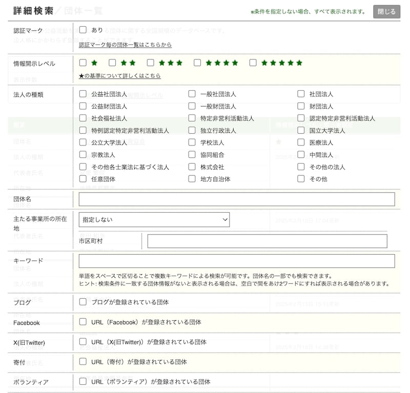 メニュー「団体情報」にある検索機能では、情報開示レベルや、ブログやSNSの実施有無、ボランティア情報なども絞ることができるのも便利だ。