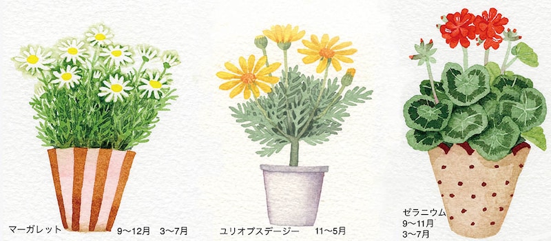 秋に買って長く楽しめる花の代表的なものは、マーガレット、ユリオプスデージー、ゼラニウム、ブルーデージー。咲き終わった花(花がら)をこまめに摘み取ることで、長く花を咲かせ続けてくれます。