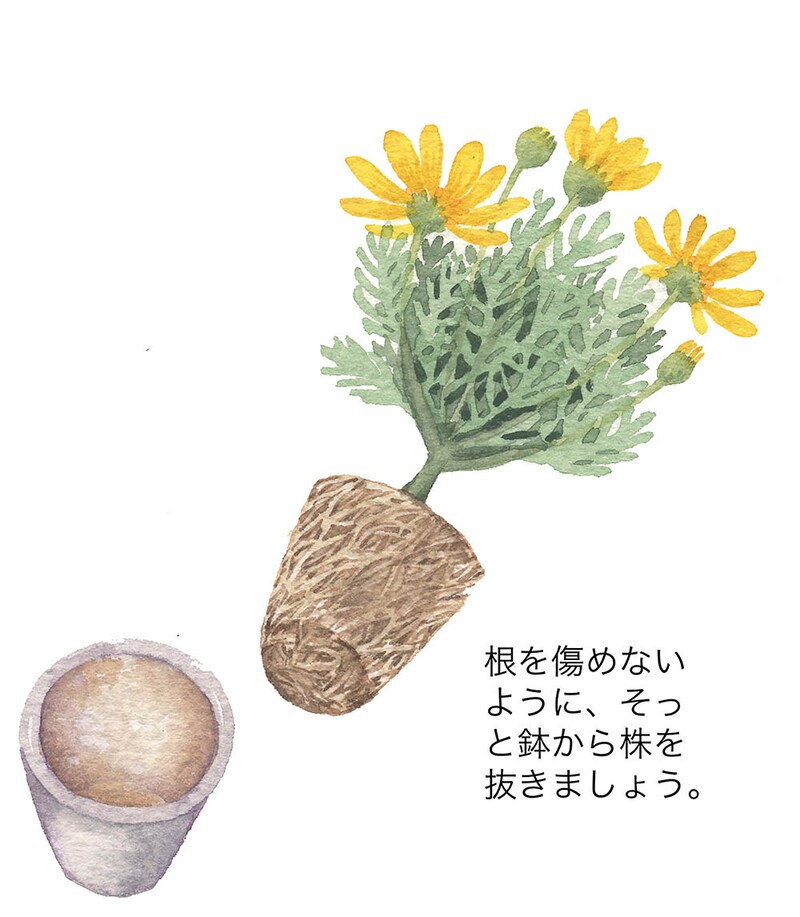 作業の際は、まず土を乾き気味にしておき、根をなるべく傷めないようにやさしく土をほぐします。 必要であれば、根を切り落とします。