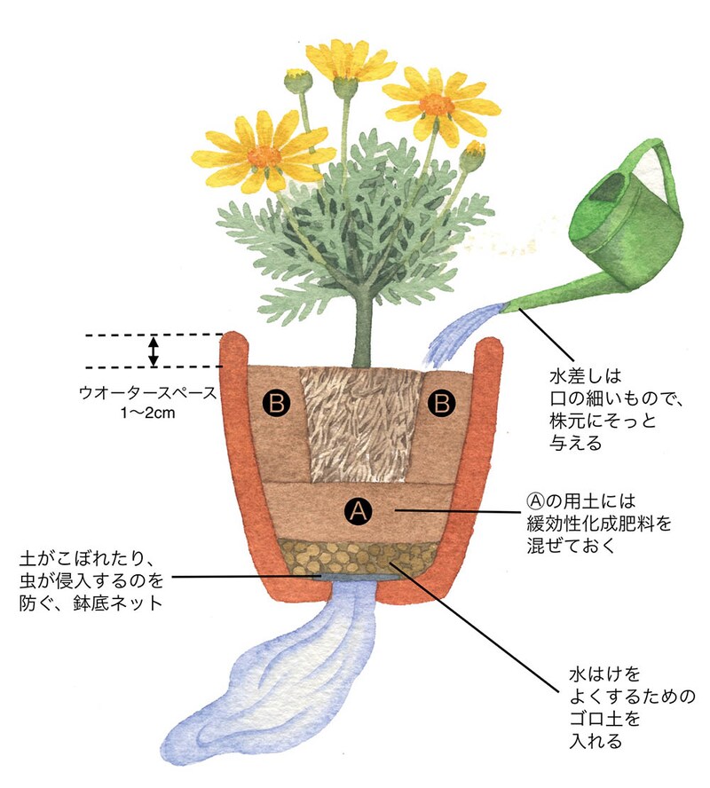 元の株よりひと回り大きな鉢を用意し、Ⓐの部分に用土を入れます。その上に株を置き、Ⓑの部分に用土を詰めます。植え替えが終わったら、鉢底から水が流れ出るくらいたっぷりと水を与えます。