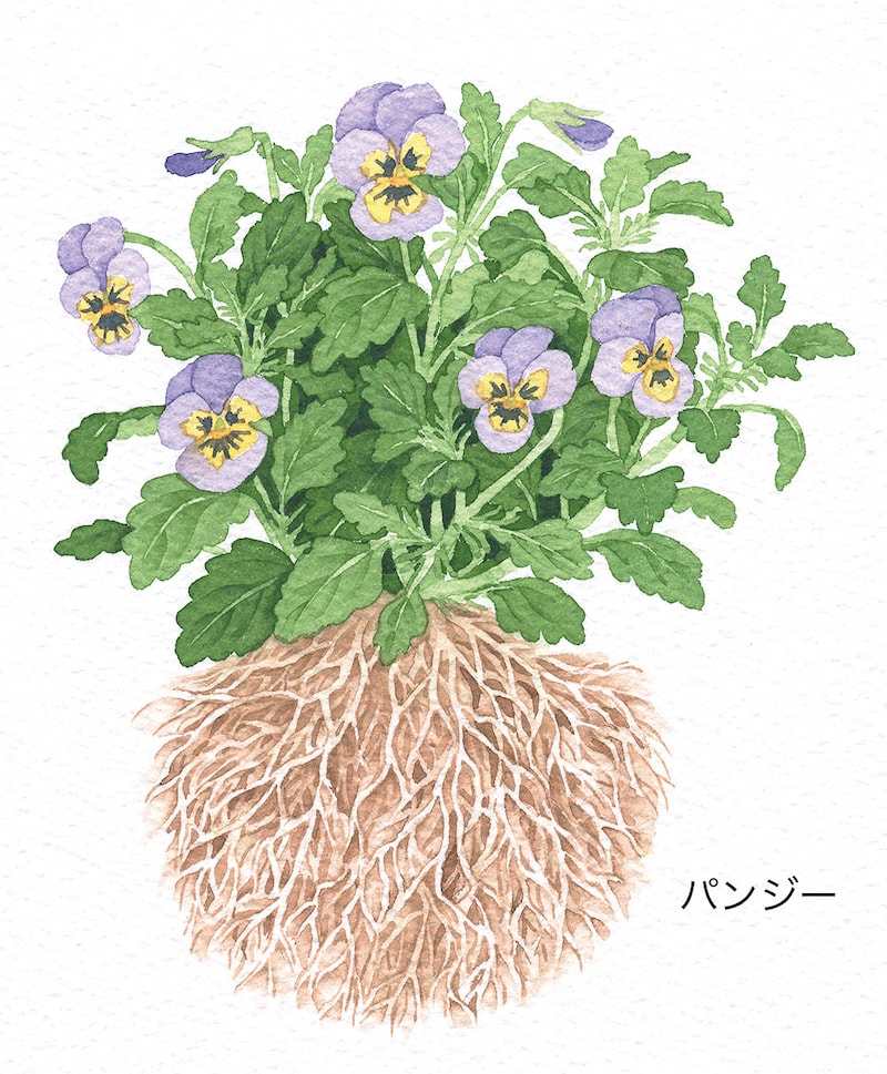パンジーなど多くの草花がこのタイプです。根が多少切れても、そこから根が分枝して伸びます。