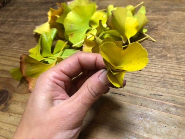 イチョウの葉でも、簡単にとても素敵なお花を作ることができます。今年は、まだそれほど葉が落ちていなかったので、少しだけ拾ってきた落ち葉でお花を作ってみました。