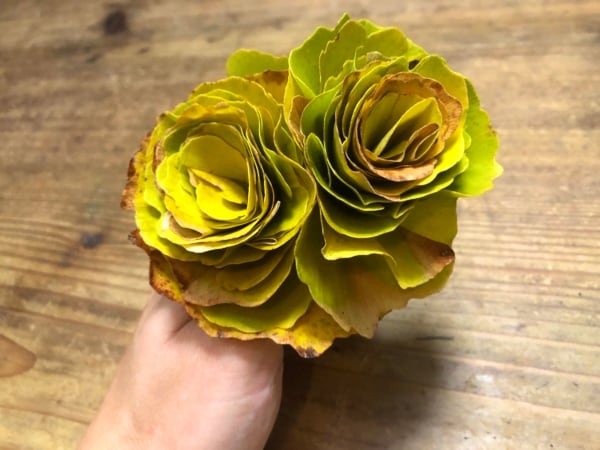 毎年、娘と一緒にお隣のMさんの畑にあるイチョウの葉を拾わせてもらっています。 くるくる巻く作業はとても簡単だし、黄色い葉も、緑っぽい葉も、少し茶色くなった葉も、全部混ぜてお花にしてしまえば個性が出て良い感じになるので、細かいことは気にせず、是非一度作ってみてください。楽しいですよ!