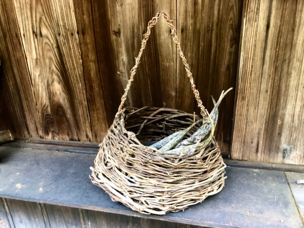 クズは庭に茂っていると取り除くのにかなり手間取る厄介な植物ですが、今年はカゴの材料になると思うと、どんどん伸びておくれ、と応援する気持ちにすらなりました。成長を見守りつつ、夏の終わり頃から順番に収穫して、葉っぱを取り除いて乾燥させてから使用します。 乾燥させすぎてガチガチに乾いてしまったものは、少し水につけて戻してから編んでみました。茎が太いのでさくさく編めて、娘も、初めてながら大きめのカゴが編めて大満足。 適当に編んでもなんだか良い雰囲気になるし、何より、来年の夏の畑での収穫作業に活躍してくれそうで今から楽しみです。
