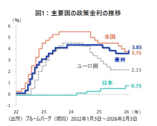 豪州準備銀行(RBA)は2月3日の理事会において、政策金利を3.85%へ引き上げる決定を下しました(図1)。日本を除く主要国の中で、豪州は利上げへ転換した最初の国となりました。