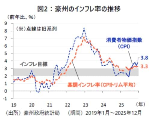 RBAは利上げを決定した背景として、2025年後半にインフレ圧力が強まり、インフレ率が一定期間にわたり目標を上回る可能性が高まったことを挙げています。豪州の消費者物価指数(CPI)は2025年12月に前年比+3.8%へ伸びが加速し、基調インフレ率も同+3.3%とインフレ目標を上回る推移が続いています(図2)。