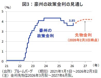 RBAのミシェル・ブロック総裁は記者会見において、需要やインフレの動向次第では追加利上げが必要になる可能性があると述べました。先物市場では、2026年末まで1~2回程度の利上げが織り込まれつつあり、利上げ観測は引き続き根強い状態にあります(図3)。