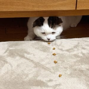生まれは京都、育ちは大阪の6歳オス。いなほという名前は、飼い主が大好きなスピッツの曲名から。コーヒーこぼしちゃったみたいなアゴの茶色の斑点が、オレのチャームポイント。飼い主さんには、かなり用心深く繊細なタイプと言われてて、インターホンの音が鳴ると雲隠れし、ティッシュを抜く音にさえびっくりして跳び上がってしまうほど。本誌2021年7月号にて、わたなべとしふみさんによるいなほの紹介イラストを掲載しています。