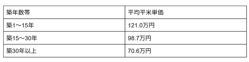 マンションナビが公開する世田谷区の築年数帯ごとの平均平米単価を見ると、築浅と築古の差がわずか22万円(平米単価)程度に収まっていることに驚かされる。