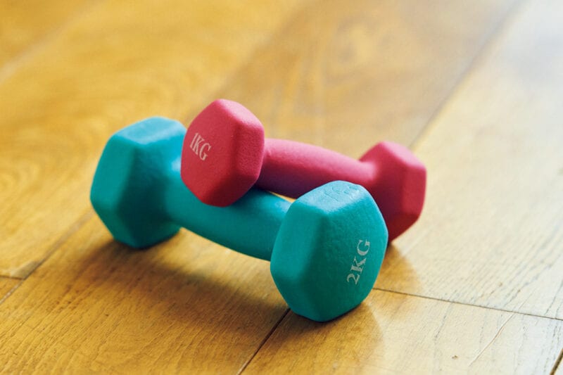 かわいい色のダンベルで、やる気をアップ。