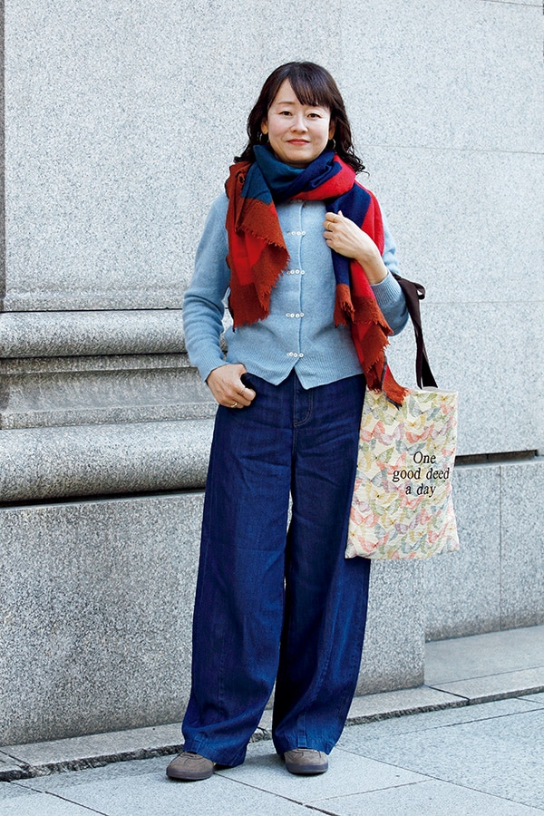 温かく、肌触りのいいカシミヤセーターが冬の定番。「絵画を落とし込んだようなゴブラン織りのバッグがポイントです」。