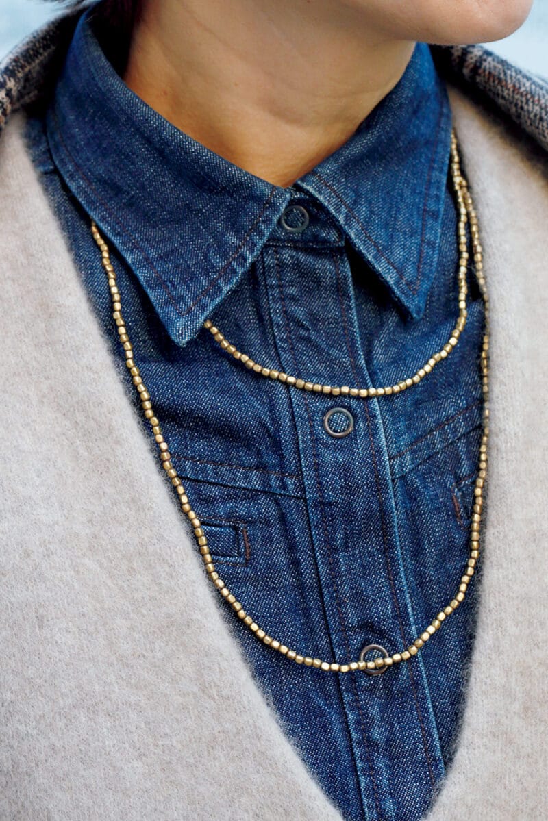 木製のピアスとビーズネックレスのクラフト感にほっこり。