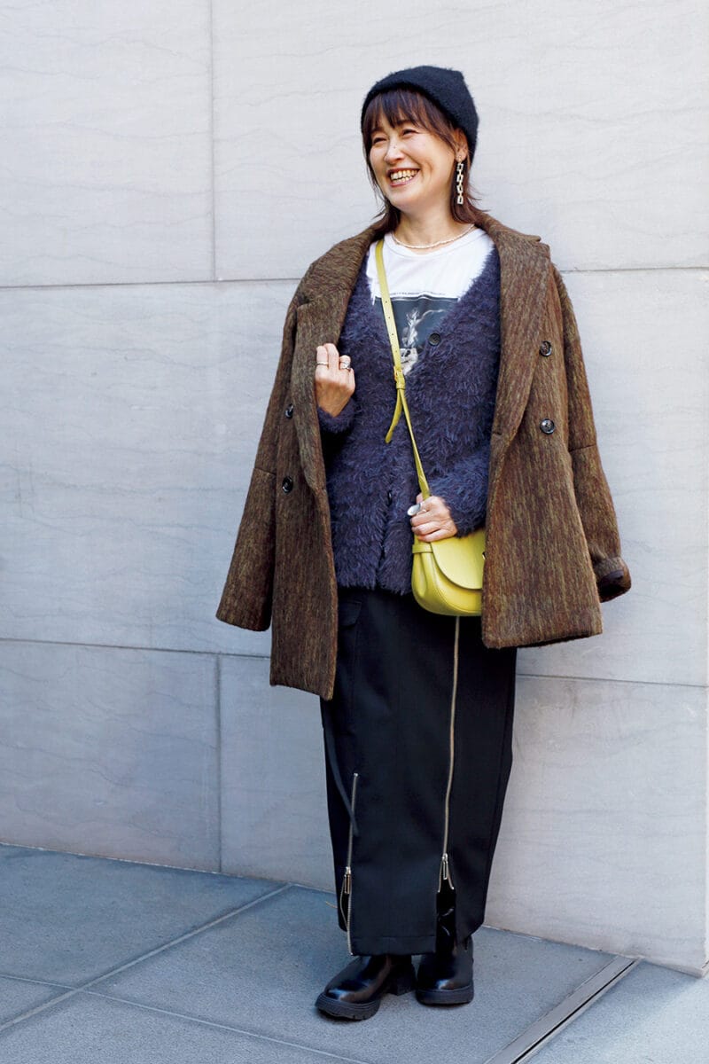 「甘辛ミックスを楽しみたくてシャギーニットを選びました」。ジャケットを重ねて、きちんと感も意識。