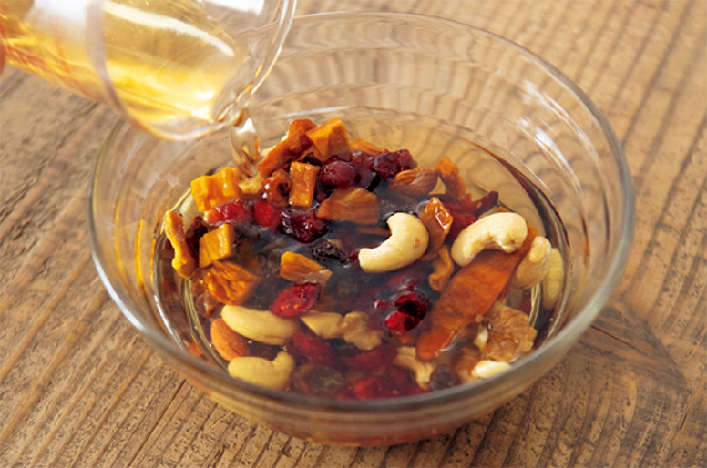 酢150mLに、レーズン30g、一口大に切ったドライマンゴー20g、クランベリー20g、ミックスナッツ30gを漬け、5時間〜1晩置く。ドライフルーツとナッツはお好みで。