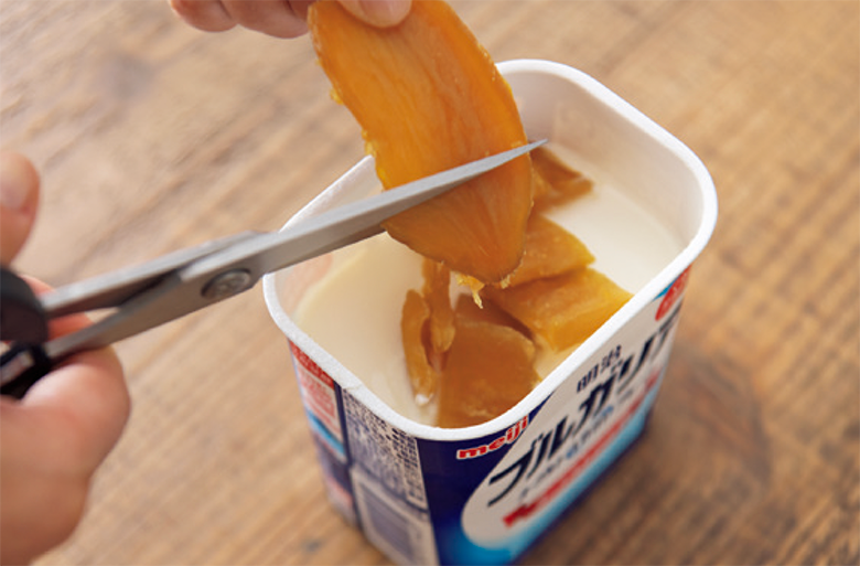 無糖ヨーグルト450mLのパックに、2〜3cmにカットした干しいも120g分を漬けた状態で1晩置く。