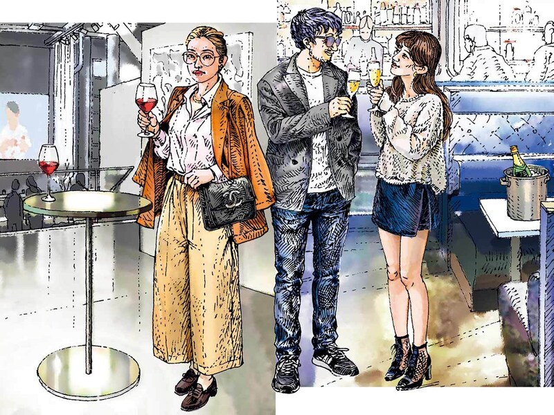 バーマスターが日本各地のワイナリーを巡って仕入れたナチュラルワインを手に、現代アートに触れて感性を磨いているおふたりに編集部がお声がけした。