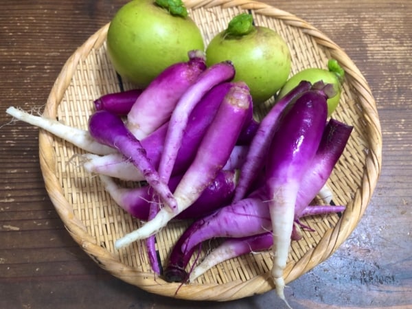 津田カブ 鈴木さんの津田カブ。松江市の津田地区で昔から栽培されていたカブだそう。 甘くて良い香り。色もとても綺麗です。