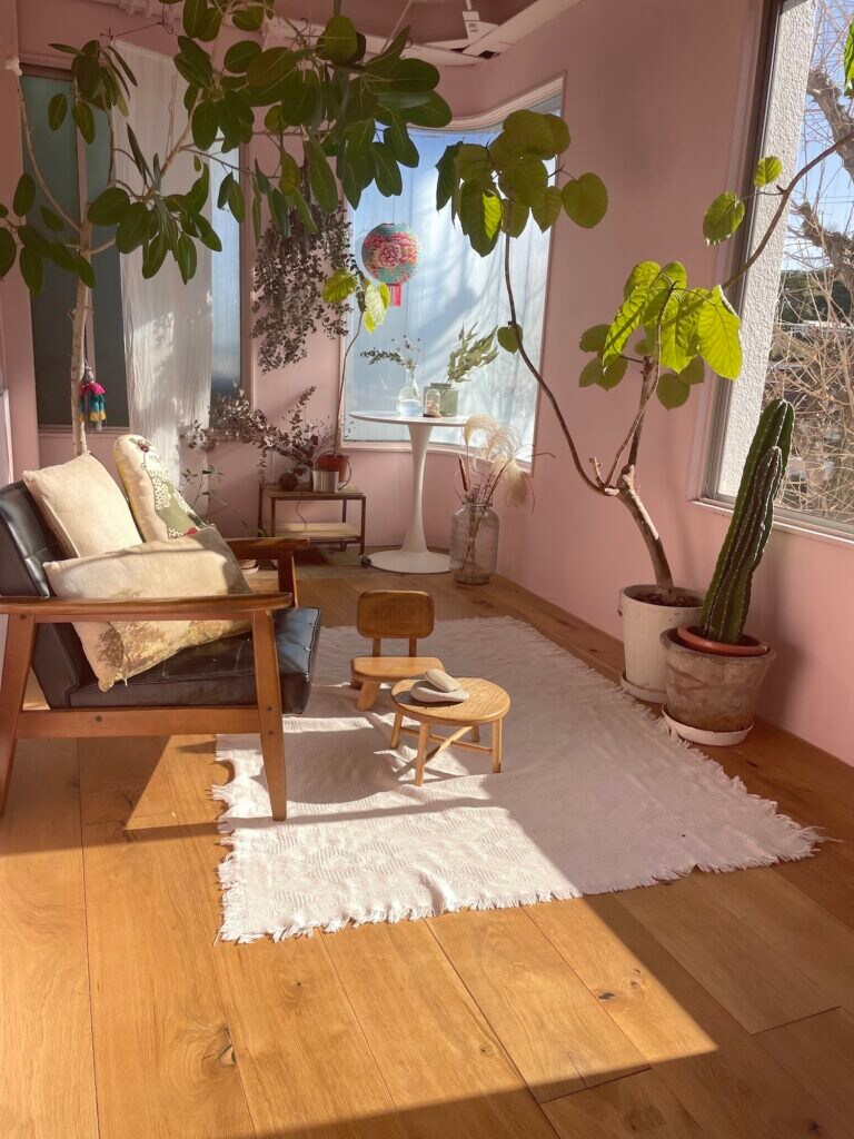 淡いピンク色の壁は、植物の緑がよく映える。陽当たり良好で、ウンベラータもゴムの木も、どんどん大きくなっていく。