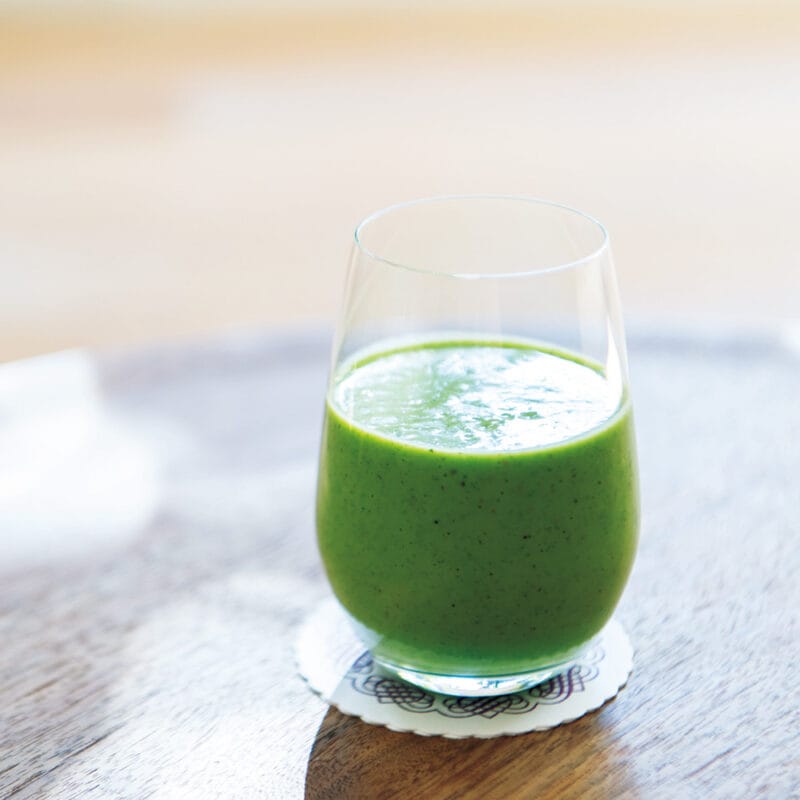 糀甘酒、オーツミルク、高たんぱくヨーグルト、バナナ、皮ごとキウイ、冷凍保存で常備しているケールとパセリ、MCTオイル、オリゴ糖を加えた栄養満点の甘酒スムージーが毎日の朝食メニュー。「夫婦でいただきます」