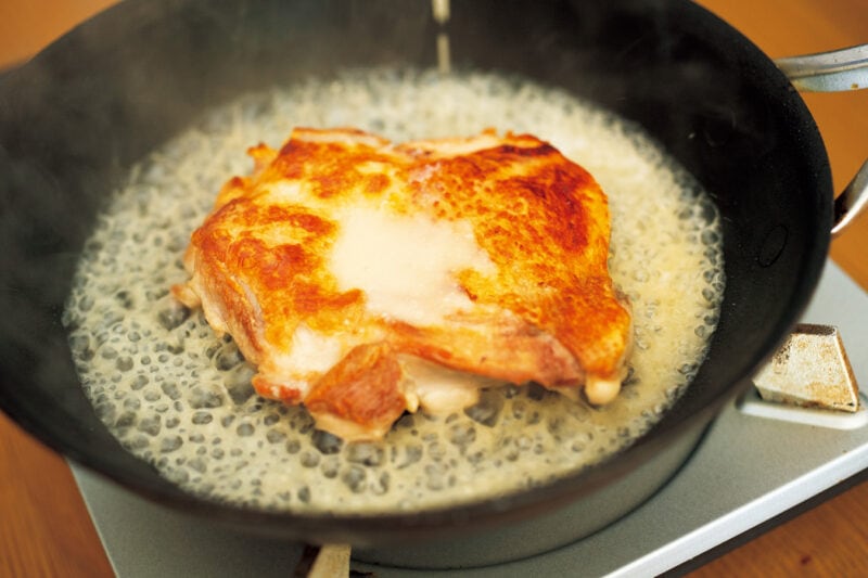 鶏肉を焼いたフライパンに糀甘酒としょうゆを加えるだけ。
