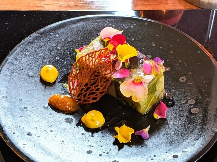 華やかでパッと目をひく、ある日の『~Entrée froide~ 小山農園 旬野菜とエディブルフラワーのテリーヌ』。契約農家直送の季節野菜と何種ものカラフルなエディブルフラワーが一皿にぎゅっと凝縮し、四季の彩りと香り、旬の滋味が丁寧に表現されたコース限定で楽しむことができる【Freeeat】のスペシャリテです