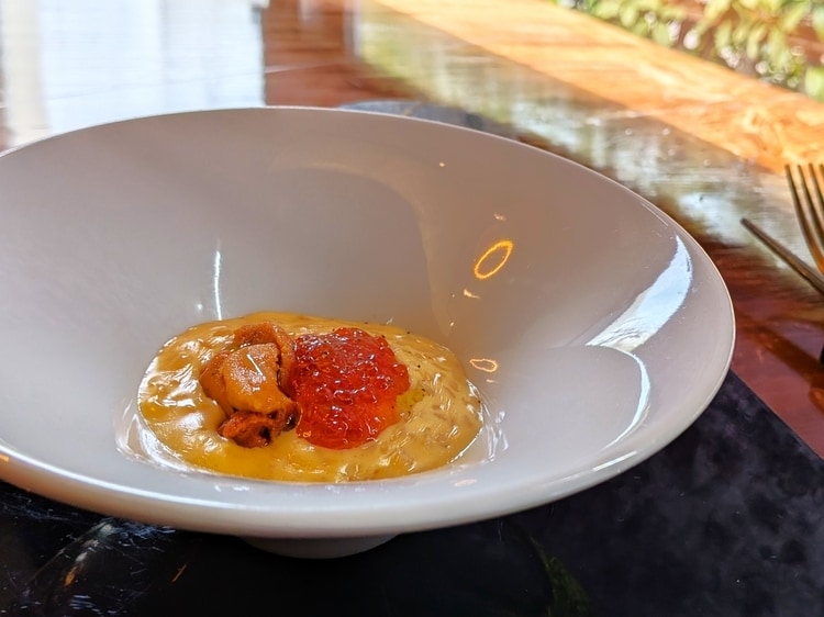ある日のランチコースで登場した、一口食べた途端に心を鷲掴みにされてしまった一品『~Entrée chaude~ ウニのリゾット』。年間契約をしているという北海道産ウニを使用しているとのことで、そのクリーミーな甘みと旨みがたっぷり感じられる粒立ちの美しいリゾットです。いくらの優しい塩味も絶妙。コースやアラカルトでも注文できる、お店からもイチオシの逸品です