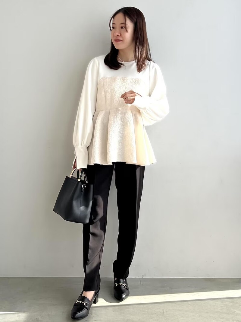 バスト下からフレアの切り替えが入っているペプラムトップスは、きれいめに着られてスタイルアップも叶う万能アイテム。