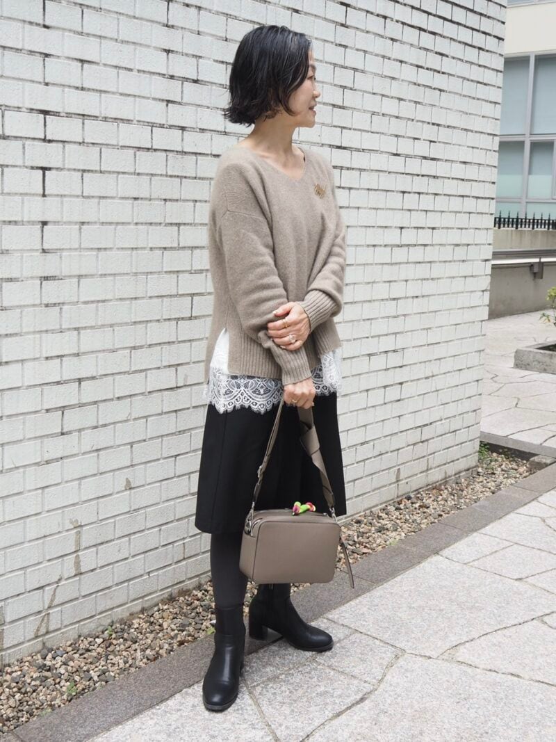 肌触りのいい「ナノユニバース」のニットはミナさんの冬の定番。「今日は裾からキャミソールをのぞかせて、レイヤードにチャレンジしてみました」。ベーシックなカラーでまとめつつ、さりげない重ね着やハーフパンツとショートブーツのバランスによって、シンプル過ぎず立体感のある装いに。
