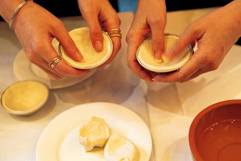 特製生地をタルト型に入れ、回転させながら親指で押し広げる。1個45秒以内