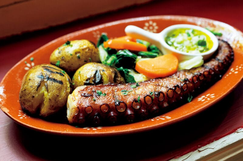 タコをたっぷりのオリーブオイルで焼いた料理で、軽く潰した焼きポテトが定番の付け合わせ。