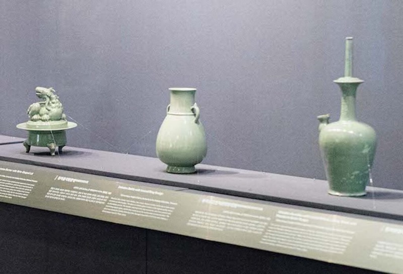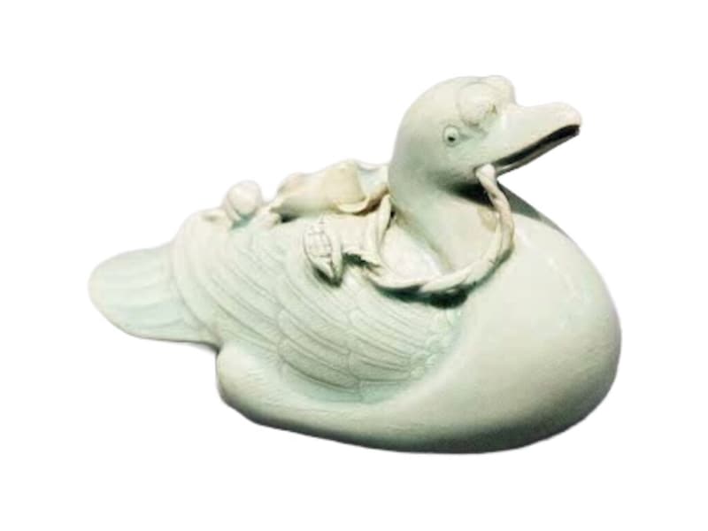 鴨が蓮の茎をくわえる姿を表した「青磁鴨形硯滴 」。