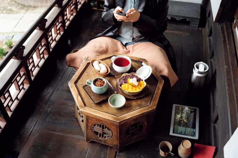 五味子茶やナツメ茶のような伝統茶と、それに合う餅菓子や薬菓(ヤックァ)、ピンスなどが楽しめる。国産の良質な材料を使い、甘さ控えめ。