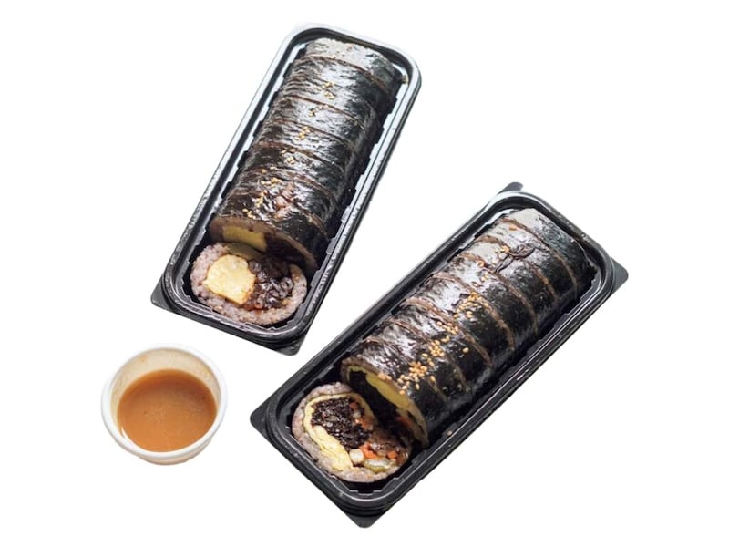 左はパッコジ(干瓢)キンパ9,000W、右は野菜キンパ(牛蒡、人参、たくあん、卵、スパム入り)5,000W。