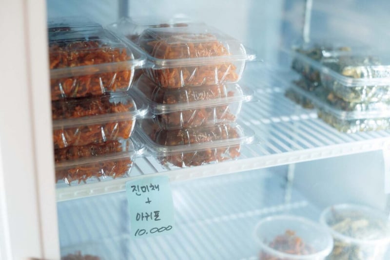 キンパのほかに、さきいかをコチュジャンベースのたれで和えたジンミチェやじゃこ炒めのミョルチポックムなどといったおかずも販売。