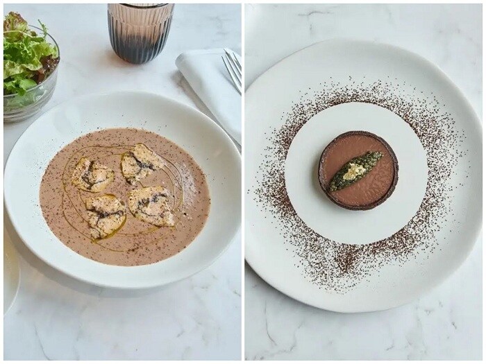 ──「タルト ショコラ キャビア」はダークガナッシュとキャビアの風味のマリアージュ、「栗のスープ」は、栗とショコラが上品にマリアージュしています。